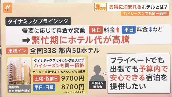 これを導入していない「東横イン」がおすすめということです。全国338、都内50ホテルを展開していますが、ダイナミックプライシングを導入していないため、ハイシーズンも同一価格です。