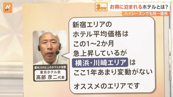 さらに、都内200以上のホテルが加盟する「東京ホテル会」の高部彦二代表によると、「新宿エリアのホテル平均価格は、この1~2か月急上昇しているが、横浜・川崎エリアはここ1年あまり変動がない。オススメのエリアです」ということでした。