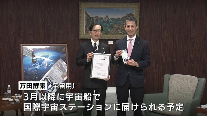 報告したのは万田発酵の松浦良紀社長など4人です。万田発酵が開発した「万田酵素(宇宙用)」は、おととし11月、県内で初めてJAXAから「宇宙日本食」として認証されました。