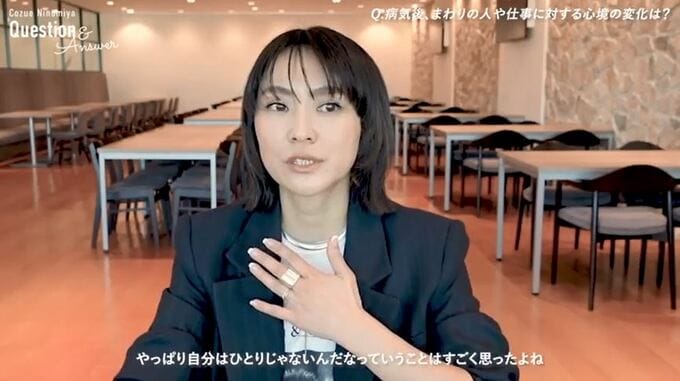 二宮さんはモデルとして。ファッション関連の質問に精力的に答え、自分が構想している仕事を徐々に始めていくとしました。また、前回の動画で語った開頭手術に際して「髪の毛を剃りましたか?」という質問には ”坊主にするつもりだったの” と当初思ったものの、剃りは切開部位の周囲だけで済んだと伝えました。