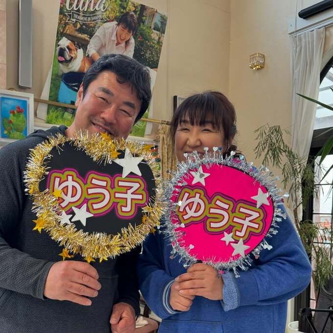 北斗さんは、夫の佐々木健介さんとの2ショットで「ゆう子」と大書されキラキラモールで飾られた推しうちわを披露して満面の笑顔。「26日 浅野ゆう子さん50周年記念LIVEに友達と皆んなで行くので頑張りました〜!!」と「推し」を明かしました。