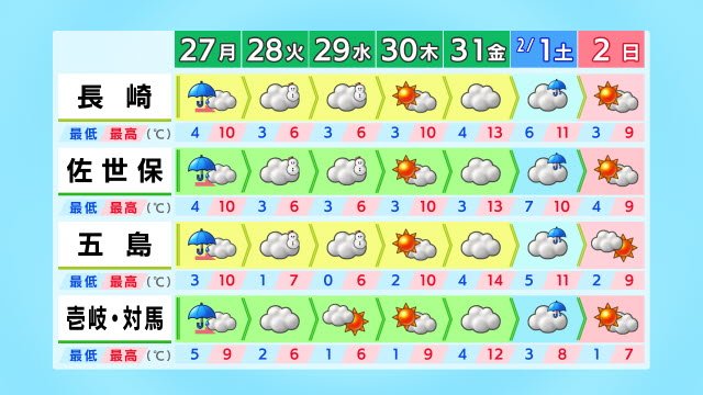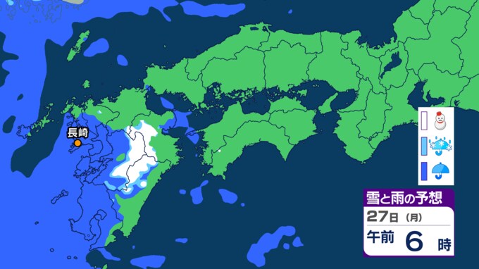長崎県内では27日(月)には午前を中心に冷たい雨が降り、山沿いでは雪が降る可能性があります。