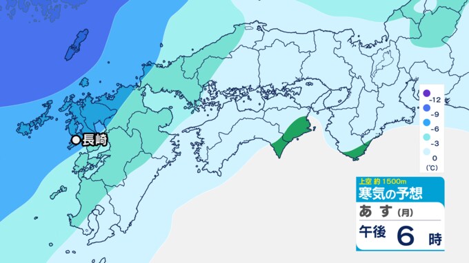 雪を降らせる目安となる上空1500メートルの-6℃以下の寒気が長崎県内に流れ込み、28日(火)から29日(水)にかけては平野部でも雪が降りやすくなります。