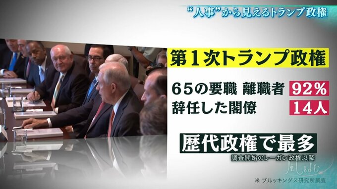 第1次トランプ政権の4年間で65の要職のうち、9割以上で離職があり、 辞任した閣僚は14人と歴代の政権で最多となったのです。