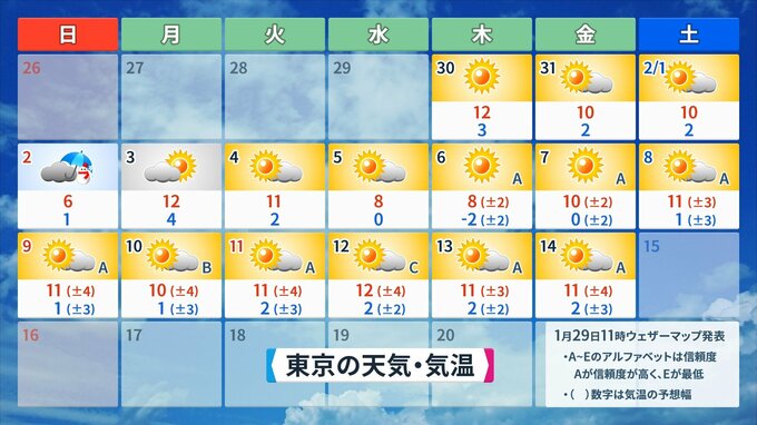 東京は、強い寒気が入る直前の2日(日)に、雨か雪の予想。