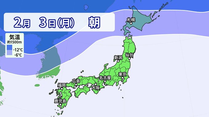 2月3日(月)以降は、上空1500m付近でー12℃以下は、平地でも大雪のおそれがある寒気です。この日は「立春」。今シーズン一番の強い「立春寒波」がやってきます。