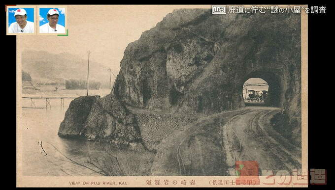 「絵葉書に、岩崎の岩隧道、富士川と書いてある。同じ隧道の別ポジションの写真もあり、隧道内から見た景色には富士山が写っていた」