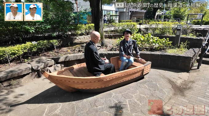 「この山谷堀が吉原に繋がっている」と髙山さん。暗渠道をたどると、公園の路上に設置された舟を発見!