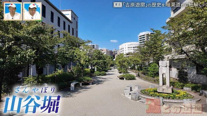 そんな吉原遊郭にまつわる暗渠道をたどるため、最初に向かったのは山谷堀(さんやぼり)広場。江戸時代初期に開削された人工の水路「山谷堀」の痕跡として、広場の一角には水門や、「いまどはし」と書かれた橋の親柱が残っています。