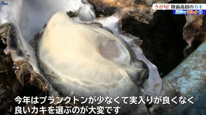 「本当に良いのと悪いのとはっきりしています。すべてが良いかって言えばそうじゃなくて、今年はプランクトンが全然少なくて実入りが良くなくて、こういうカキを選ぶのがなかなか大変ですね」
