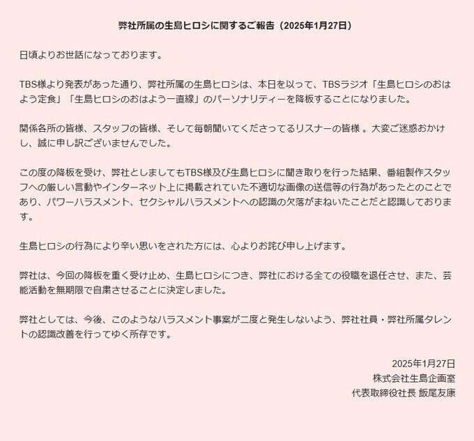 「生島ヒロシの行為により辛い思いをされた方には、心よりお詫び申し上げます」「弊社は、今回の降板を重く受け止め、生島ヒロシにつき、弊社における全ての役職を退任させ、また、芸能活動を無期限で自粛させることに決定しました」「弊社としては、今後、このようなハラスメント事案が二度と発生しないよう、弊社社員・弊社所属タレントの認識改善を行ってゆく所存です」としています。