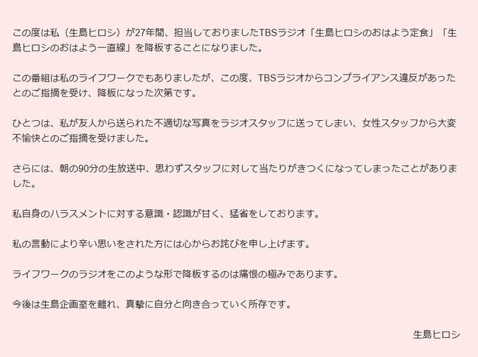 「この度の降板を受け、弊社としましてもTBS様及び生島ヒロシに聞き取りを行った結果、番組製作スタッフへの厳しい言動やインターネット上に掲載されていた不適切な画像の送信等の行為があったとのことであり、パワーハラスメント、セクシャルハラスメントへの認識の欠落がまねいたことだと認識しております」と聞き取り内容について説明しました。