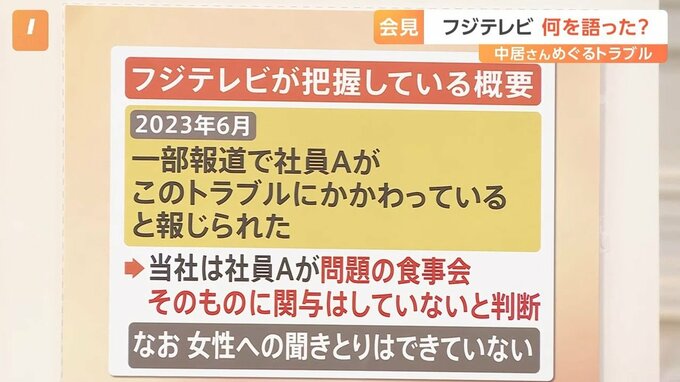 →フジテレビは社員Aが問題の食事会そのものに関与はしていないと判断。なお、女性への聞き取りはできていない。