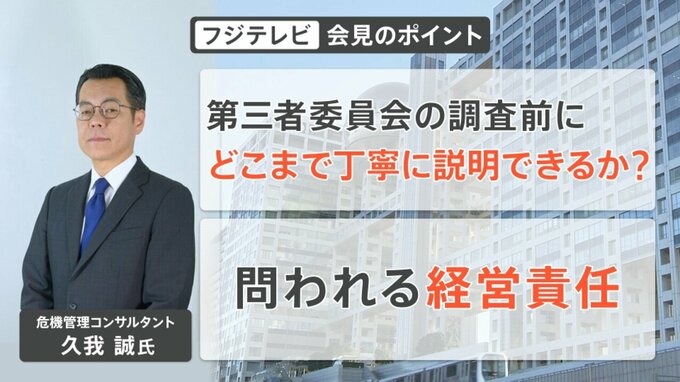 危機管理コンサルタントの久我誠さんに、フジテレビの会見の注目ポイントを挙げてもらいました。