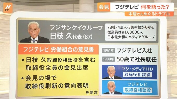 フジテレビの労働組合の意見書では、▼日枝久取締役相談役を含む取締役全員の会見出席、▼会見の場で取締役刷新の意向表明を要求してきました。