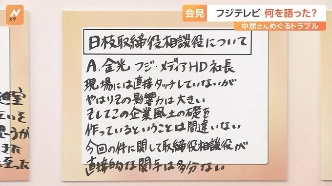 「今回の会見はフジテレビの問題なので日枝はここには同席しません」という説明がありましたが、親会社ということを考えて日枝氏は会見に出席するべきなのか、こういった事例では問題のあった会社の経営陣だけでいいものなのか、どうお考えですか。