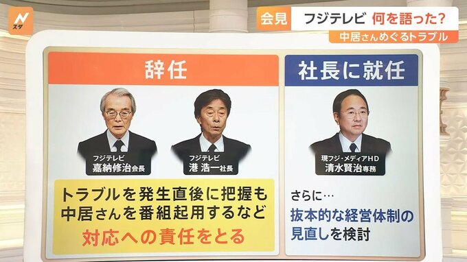 トラブルを発生直後に把握も、中居氏を番組に起用するなど、対応への責任をとる。