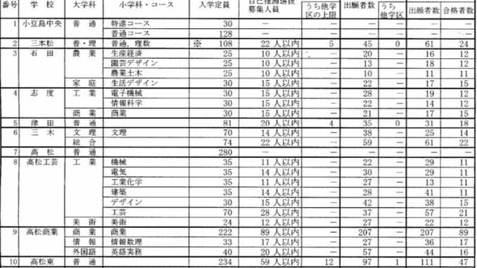 香川県の公立高校の自己推薦選抜の志願者数が発表されました。全高校の出願者数は、【画像①~④】に掲載しています。
