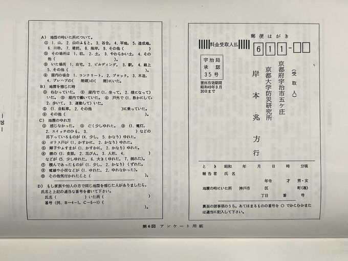 まだ地震計の設置が少なかった時代。地震の特徴を調べるため、神戸市の住民にアンケートはがきを送付。地震の揺れを感じたら、揺れ方などを書いて返信してもらう仕組みだ。その結果、「揺れやすい場所がある」と判明。そこは、後に「震災の帯」と呼ばれる阪神・淡路大震災で震度7となった帯状の地域となった。