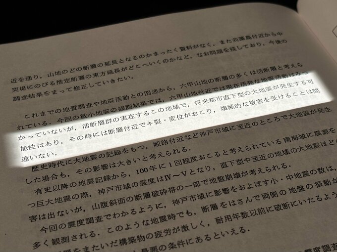 「神戸と地震」の結論は断定的で明瞭だ。たとえば、地盤調査をふまえ「活断層の数多くある神戸市周辺においても今後大地震が発生する可能性が充分ある」と。これは「活断層」ということばが自治体の報告書に登場した初の事例でもある。