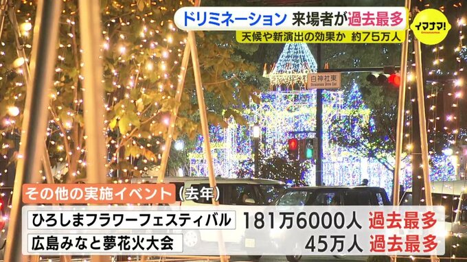 ドリミネーションを主催している広島観光コンベンションビューローによりますと、去年11月から今月の3日まで行われた「ひろしまドリミネーション」の来場者は74万9000人で、前の年より23万人増え過去最多となったということです。