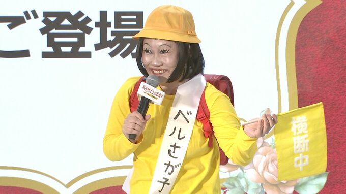 佐賀・伊万里市の観光大使を務めるキンタロー。さんは、黄色の長袖に赤い長靴、ランドセルを背負った、佐賀県の「安全ガール」になりきって登場。“佐賀県にはびこる人形です。”と挨拶し、「交通安全のために設置されている小学1年生」のモノマネで、会場の笑いを誘いました。