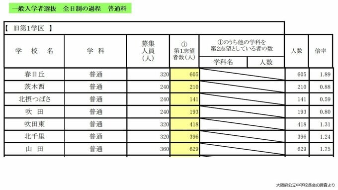 大阪府公立高校入試2025 茨木1.90倍、四條畷1.59倍、三国丘や北野の倍率は?公立希望56.5%で去年下回る【高校受験1月発表 全校掲載 令和7年度進路希望調査】 毎日放送 2025年1月28日(火) 19:15 国内 【旧第1学区】春日丘1.89倍 山田1.75倍 学校別の倍率