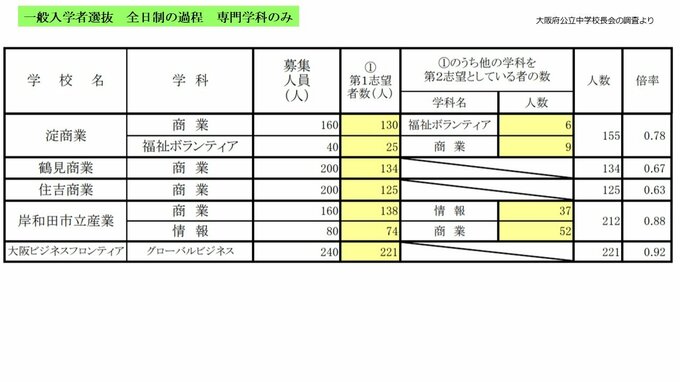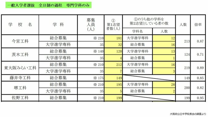 大阪府公立高校入試2025 茨木1.90倍、四條畷1.59倍、三国丘や北野の倍率は?公立希望56.5%で去年下回る【高校受験1月発表 全校掲載 令和7年度進路希望調査】 毎日放送 2025年1月28日(火) 19:15 国内 学校別の倍率 今宮工科0.87倍 市立堺0.92倍