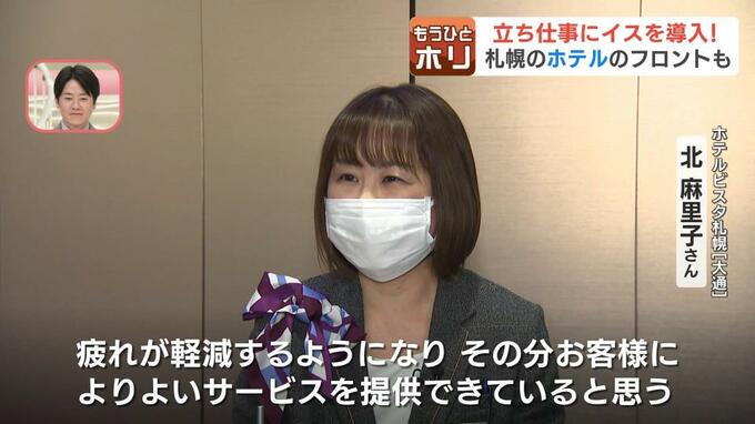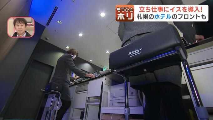 ホテルビスタでは、従業員の健康を大事にしようと、札幌をはじめ、全国15のホテル全てで、フロントにイスを導入。混雑する時間帯を除き、接客をしていない時は、イスに座れるようにしました。