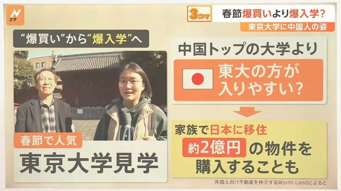 外国人向け不動産を仲介するWorth Landによると、中国トップの大学より日本の東京大学の方が入りやすいと思う人もいるそうです。そこで家族で日本に移住し、なかには約2億円の物件を購入することもあるそうです。