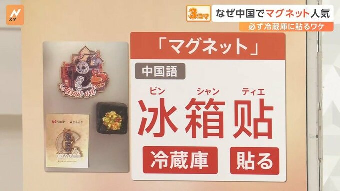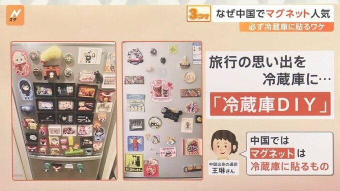 旅行の思い出を冷蔵庫に貼ることを「冷蔵庫DIY」と呼ぶそうで、Nスタの中国出身の通訳・王琳さんも「中国ではマグネットは冷蔵庫に貼るもの」と話します。