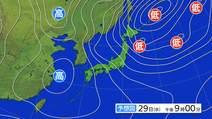 【大雪情報】29日(水)から30日(木)“JPCZ”による「発達した雪雲」は石川から新潟にかけ向かう見込み 北陸は断続的に雪が降り大雪のおそれ 最新の雪と風シミュレーション 北陸放送 2025年1月29日(水) 09:51 国内 29日(水)から30日(木)にかけて冬型の気圧配置が強まり、日本海から発達した雪雲が流れ込む見込みです。北陸では、断続的に雪が降り大雪のところもありそうです。大雪による交通障害などに注意、警戒が必要です。 29日午後9時の予想天気図を見ると、西高東低の冬型の気圧配置になりそうです。 29日(水)午後9時の予想天気図 日本海では等圧線の間隔が小さく風が強まりそうです。等圧線が西に膨らんでいるようなところでは風がぶつかり、雪雲を発達させそうです。JPCZ(日本海寒帯気団収束帯)と呼ばれるものです。