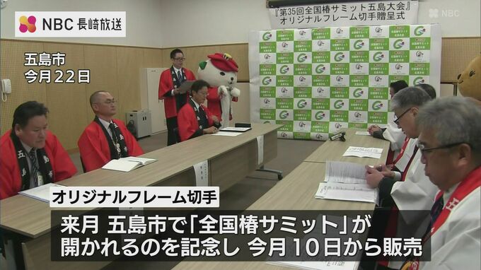 このオリジナルフレーム切手は五島市で2月に「全国椿サミット」が開かれるのを記念して1月10日から販売されていて、このほど日本郵便から出口五島市長へ贈呈されました。