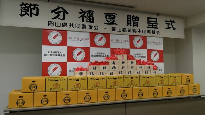 岡山市内で開かれた贈呈式では最上稲荷総本山奉賛会の末長範彦会長から、岡山県共同募金会に福豆3000袋と豆を入れる桝とみかん21箱が贈られました。福豆の贈呈は、福祉施設の利用者に節分の豆まきを楽しんでもらおうと1961年から毎年行われているもので、今年も岡山市内21の施設に贈られます。