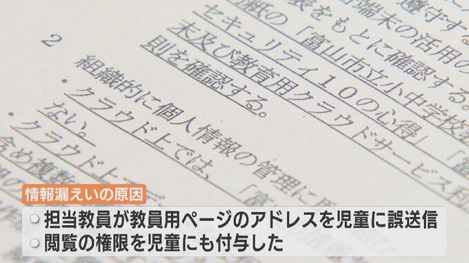 担当教員が教員用ページのアドレスを誤って児童に送ったうえ、閲覧の権限を付与し児童も閲覧可能にしたことが原因だとしています。