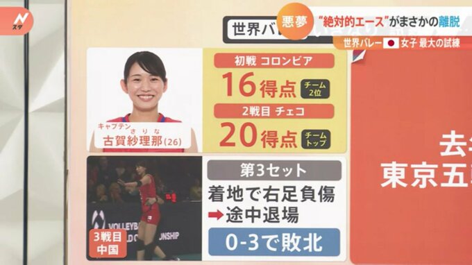 女子日本代表のエースといえば、キャプテンの古賀紗理那選手です。今回の世界バレーでも初戦のコロンビア戦で16得点、2戦目のチェコ戦ではチームトップの20得点をあげています。そんな「絶対的エース」に今回、思わぬアクシデントがありました。