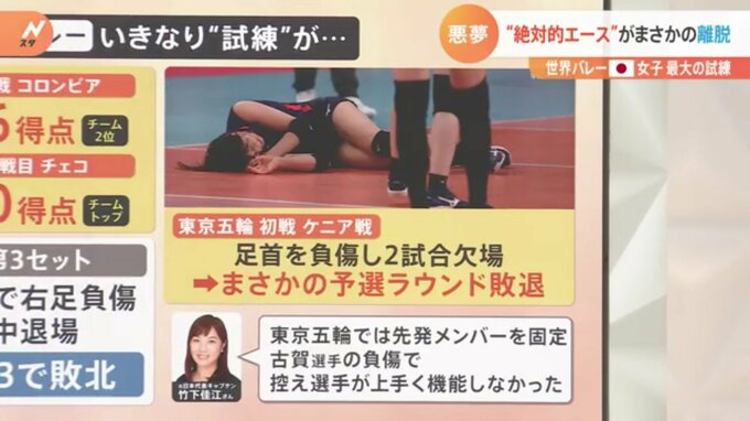 実は、2021年の東京オリンピックでも初戦のケニア戦で足首を負傷し、2試合欠場となりました。日本はメダルも期待されていましたが、オリンピックではまさかの予選ラウンド敗退という悔しい結果に終わったのです。このことについて、元日本代表キャプテンの竹下佳江さんは「東京オリンピックでは先発メンバーを固定していた。古賀選手の負傷で控え選手が上手く機能しなかった」と振り返っています。