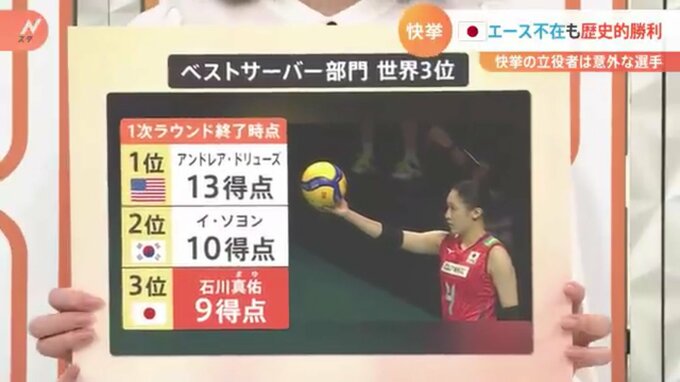 サービスエースがまさに武器になっているといえそうです。そのサービスエースの本数で競うベストサーバー部門というのがありまして、現在、石川選手は9得点で世界3位なのです。1位がアメリカのアンドレア・ドリューズ選手(13得点)、2位は韓国のイ・ソヨン選手(10得点)、韓国とは1得点差です。今後もしかしたら、2位や1位になることがありえるかもしれません。