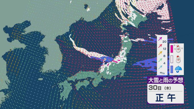 【大雪情報】30日(木)は“JPCZ”による「発達した雪雲」が新潟から石川にかけ向かう見込み 北陸は断続的に雪が降り大雪のおそれ 最新の雪と風シミュレーション 北陸放送 2025年1月29日(水) 18:37 国内 JPCZは、大陸からの風が朝鮮半島北部の山でぶつかってふた手に分かれ、その風の流れが日本海で一緒になり、冬の寒い時期は雪雲を発生させます。 30日の雪と風の予想ですが、日中は北西よりの風が北陸に吹き込み、山地では大雪になりそうです。昼前から昼過ぎにかけては能登に雪雲が流れ込む予想になっています。 30日いっぱいは、北陸で雪の降りやすい状態が続きそうです。