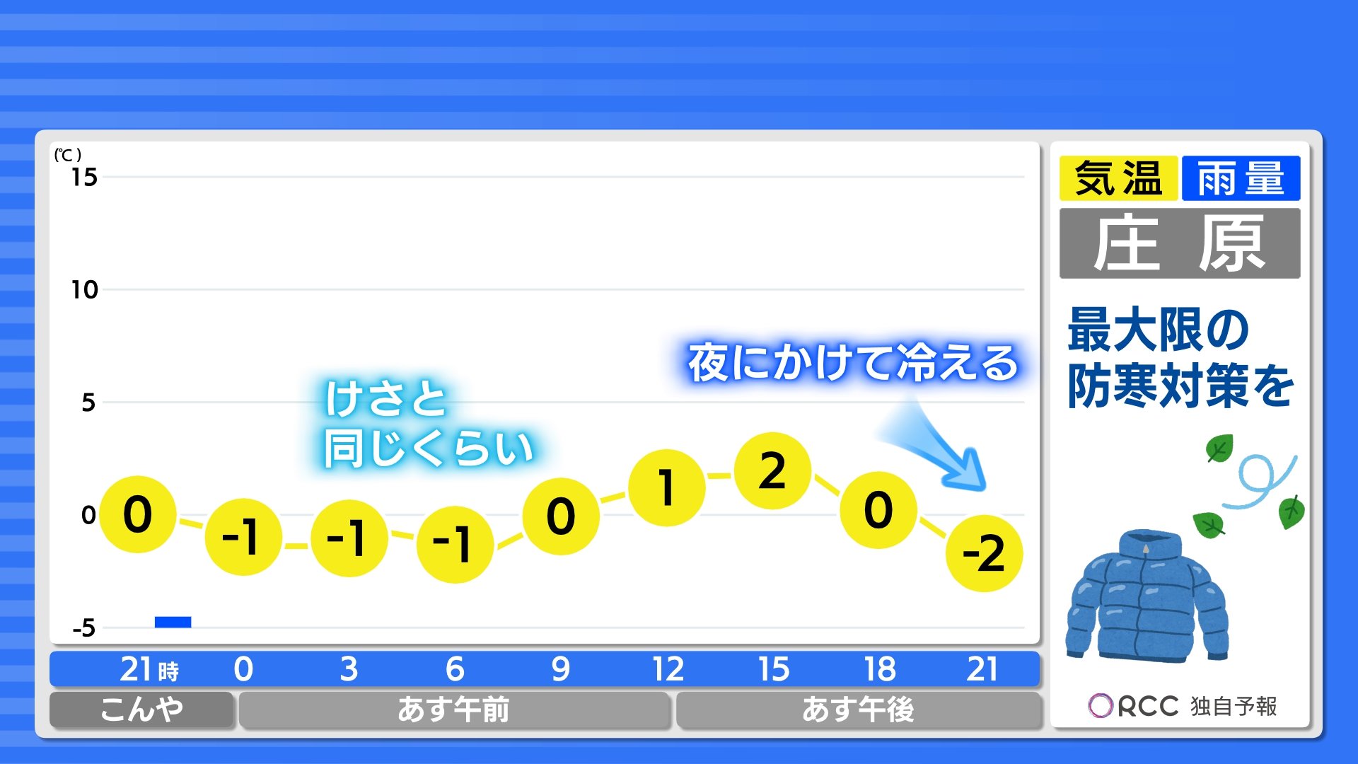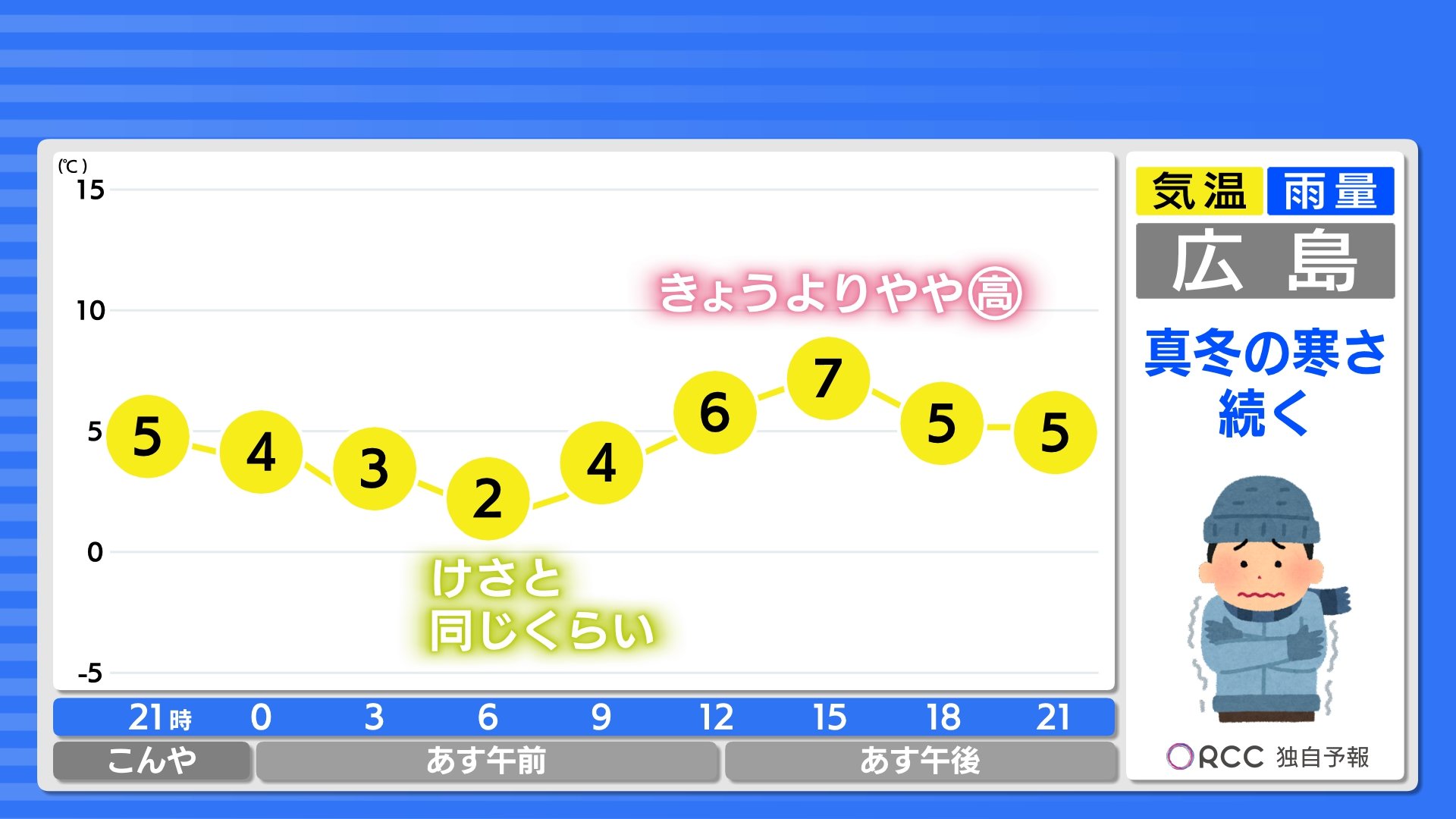 あすの日中の気温はきょうよりやや高くなりますが、明日夜にかけて気温が大きく下がる見込みです。あすも真冬並みの寒さになります。防寒対策をしっかりしてお過ごしください。