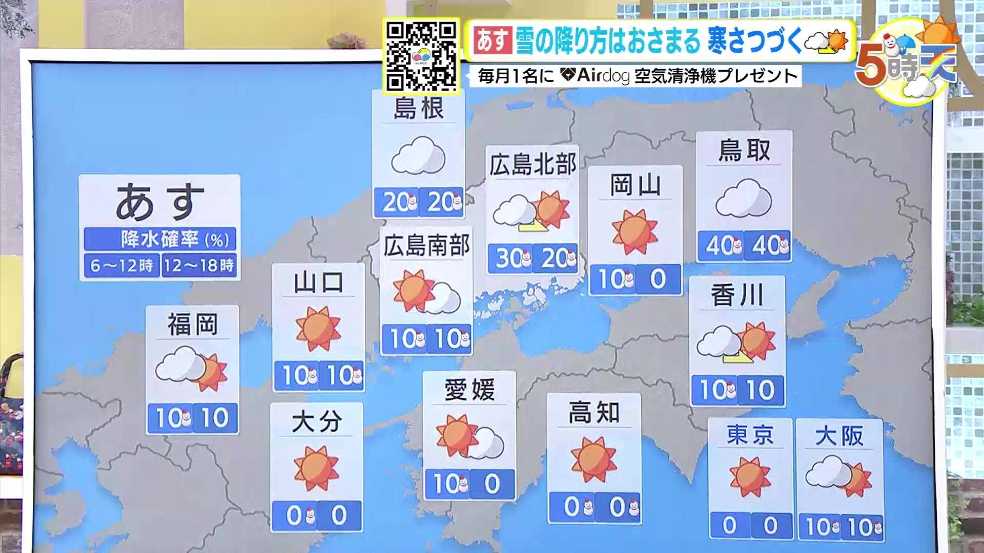 上空に寒気を伴った低気圧が本州から次第に離れていき、徐々に冬型は緩んでいく予想です。あすはきょうよりも各地で日差しがたっぷり届くでしょう。北部では、きょうほどの降り方にはならない予想ですが、昼前にかけて雪が舞う予想です。南部でもにわか雪の可能性があります。