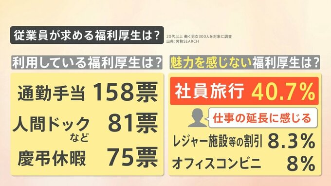 社員旅行については、楽しいという声がある一方、「仕事の延長に感じる」という声も聞かれました。
