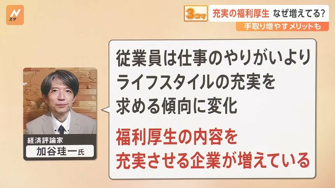 福利厚生について、経済評論家の加谷珪一氏は「従業員は仕事のやりがいよりライフスタイルの充実を求める傾向に変化。福利厚生の内容を充実させる企業が増えている」としています。