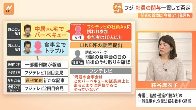 しかし、その前段階、2023年5月に中居正広さん宅でバーベキューが行われたそうです。女性はフジテレビの社員A氏に誘われ参加。参加者は10人ほど。調査メンバーが社員A氏に問題の食事会の日の前後のやり取りを確認(LINE等の履歴提出)したということです。