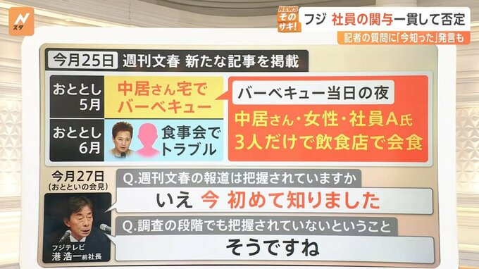 これについて27日に行われたフジテレビの会見で港浩一社長は「(Q.週刊文春の報道は把握しているか)いえ 今初めて知りました」「(Q.調査の段階でも把握していないのか)そうですね」と答えました。