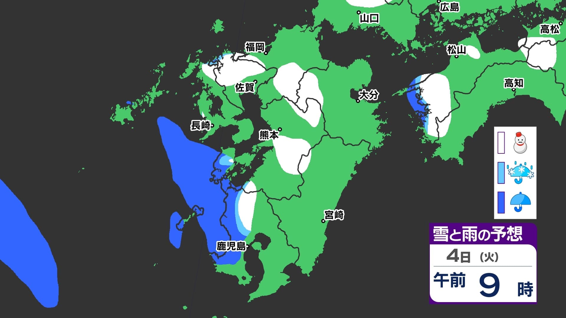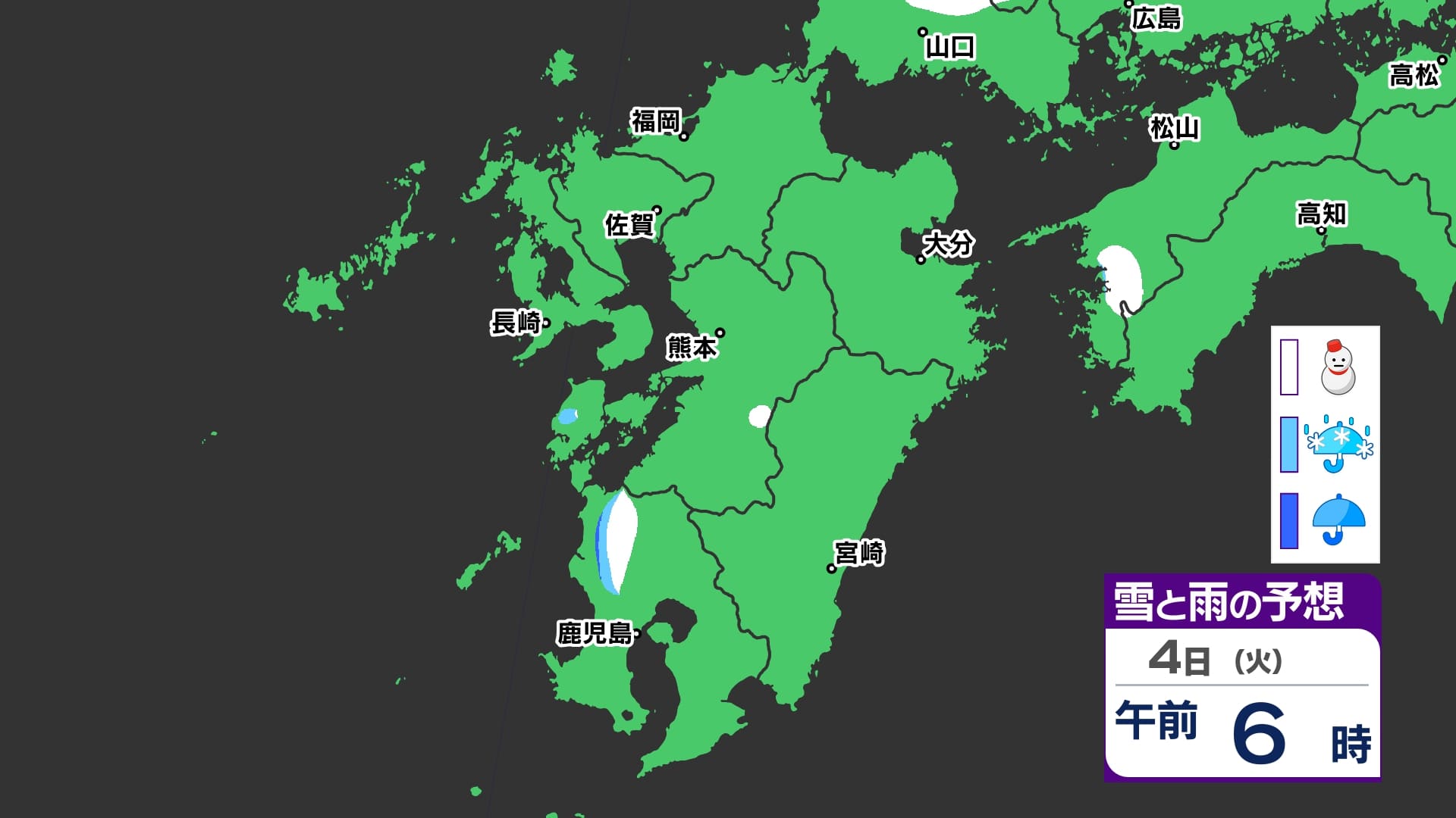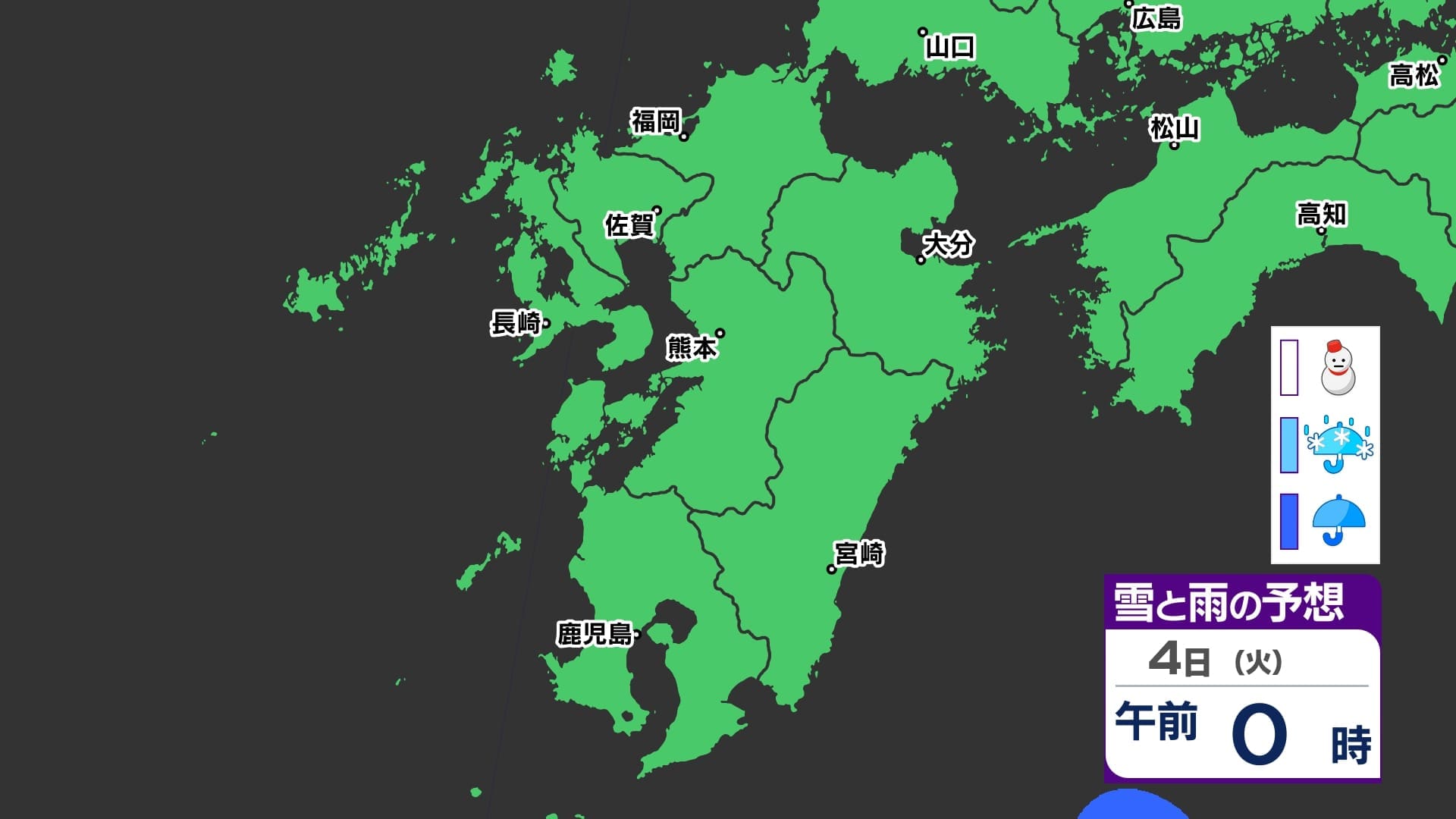 【大雨 その次は 立春なのに寒波】荒れ模様の2月スタート【福岡・佐賀・長崎・大分・熊本・宮崎・鹿児島】雨・雪のシミュレーション 南日本放送 2025年1月30日(木) 13:00 国内 天気 2月3日(月)~4日(火)雨のシミュレーション 3日(月)は熊本・宮崎の県境の山沿いで雪が予想されていますが、時間は短いです。 4日(火)福岡・佐賀・長崎・大分・熊本・宮崎・鹿児島の平地にも雪が予想されています。6日(木)にかけて雪が続く見込みです。 『白』=『雪』/『水色』=『みぞれ(雨と雪が混ざったもの)』/『青』=『雨』の予想