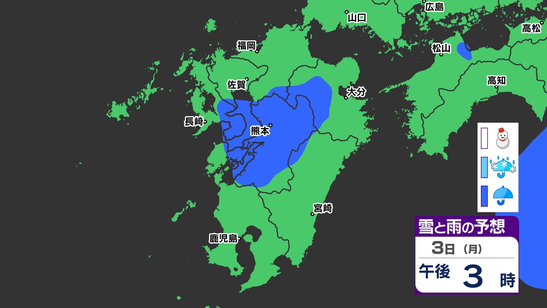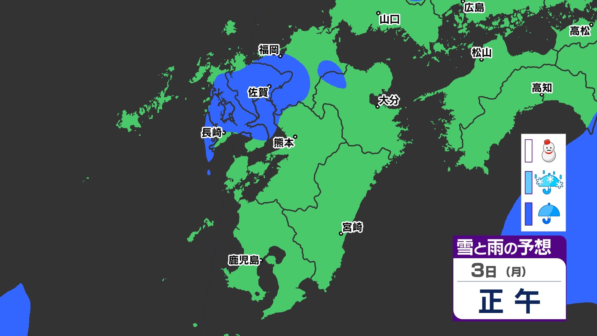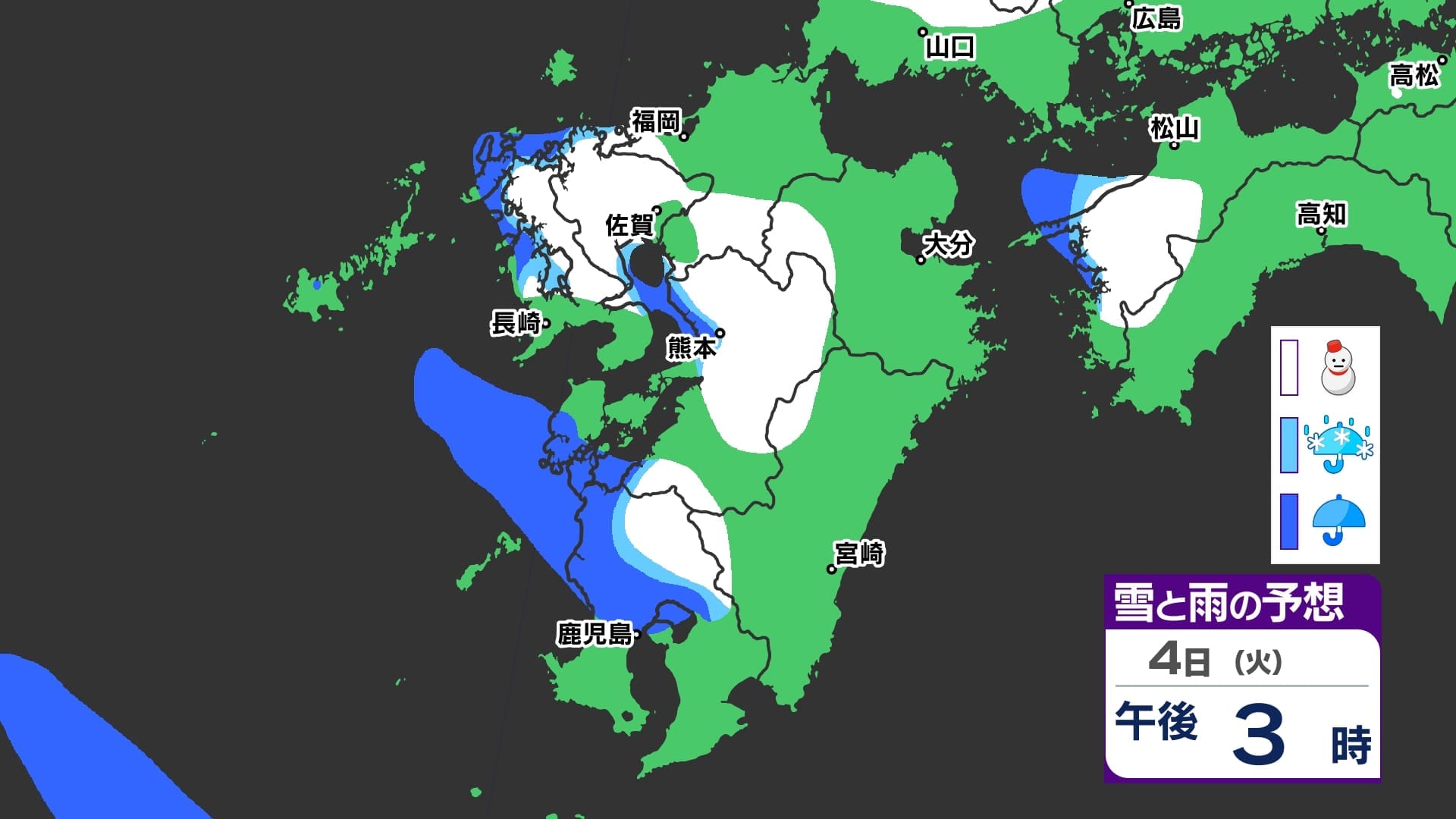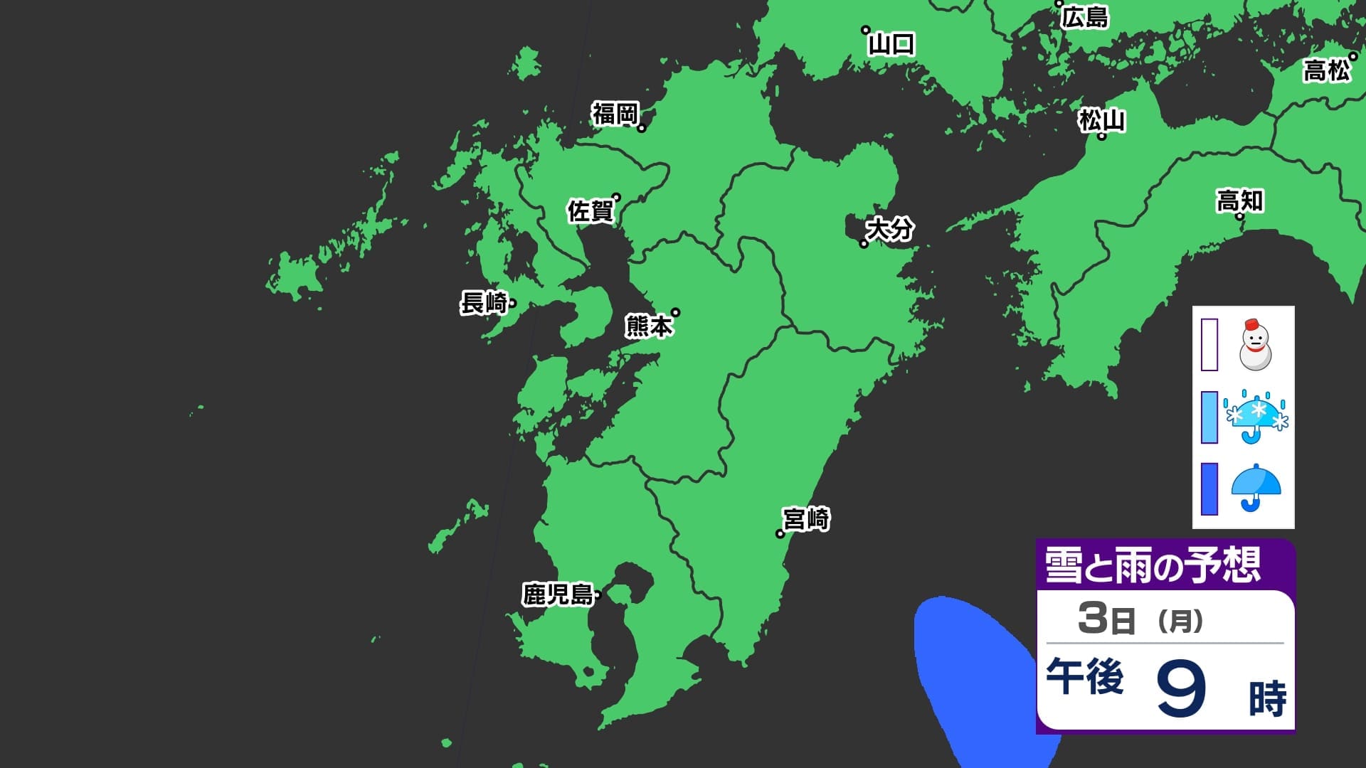 【大雨 その次は 立春なのに寒波】荒れ模様の2月スタート【福岡・佐賀・長崎・大分・熊本・宮崎・鹿児島】雨・雪のシミュレーション 南日本放送 2025年1月30日(木) 13:00 国内 天気 2月3日(月)~4日(火)雨のシミュレーション 3日(月)は熊本・宮崎の県境の山沿いで雪が予想されていますが、時間は短いです。 4日(火)福岡・佐賀・長崎・大分・熊本・宮崎・鹿児島の平地にも雪が予想されています。6日(木)にかけて雪が続く見込みです。 『白』=『雪』/『水色』=『みぞれ(雨と雪が混ざったもの)』/『青』=『雨』の予想