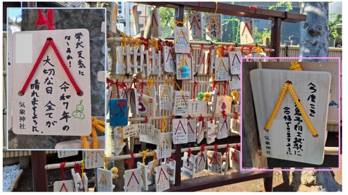 結婚式や学校行事、野外ライブなどの晴れを願ったり、気象予報士の合格祈願などが書かれた下駄絵馬。ここは日本で唯一“気象の神様”を祀る気象神社です。
