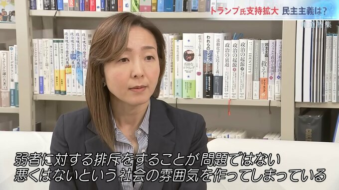 「以前は、トランプを支持していてもそれを言いにくい環境があった。隠れトランプ現象なんて言われていましたが、それが時間を経て、トランプの排斥的な言葉を良しとする、トランプを支持する立場を明らかにすることを厭わなくなったという人が圧倒的に拡大しました。これはつまり、規範の在り方として、LGBTQや女性、移民といった弱者に対する排斥をすることが問題ではない、悪くはないというような社会の雰囲気を作ってしまっている」