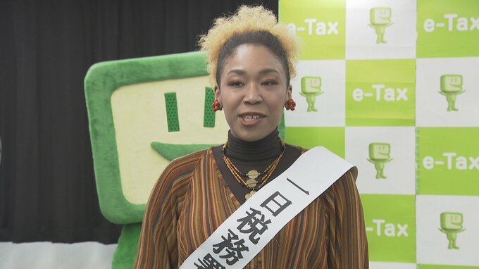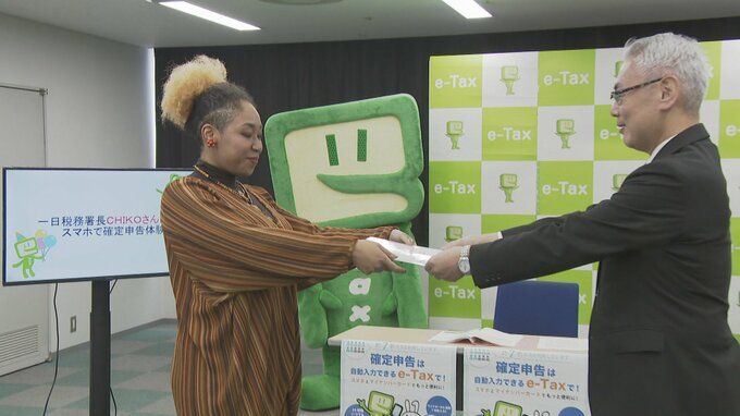 富山県魚津市出身の歌手CHIKOさんが30日魚津税務署の一日税務署長を務め、スマートフォンを使った確定申告「e‐Tax」を体験しました。